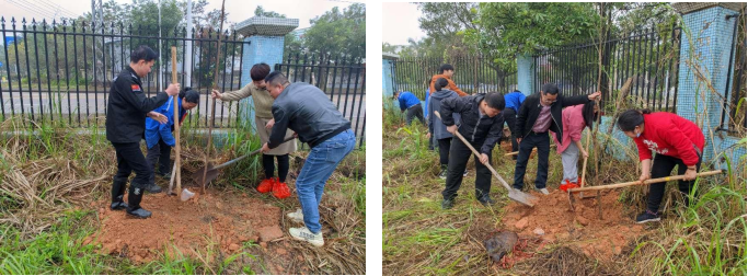 動(dòng)員結(jié)束后,大家紛紛帶好工具,前往種植地點(diǎn)。所有人分工合作:規(guī)劃位置、測(cè)量尺寸、揮鍬鏟土、扶樹(shù)填坑、踏土夯苗、配合默契……紛紛為建設(shè)"綠美廣東"貢獻(xiàn)出自己的一份力量。